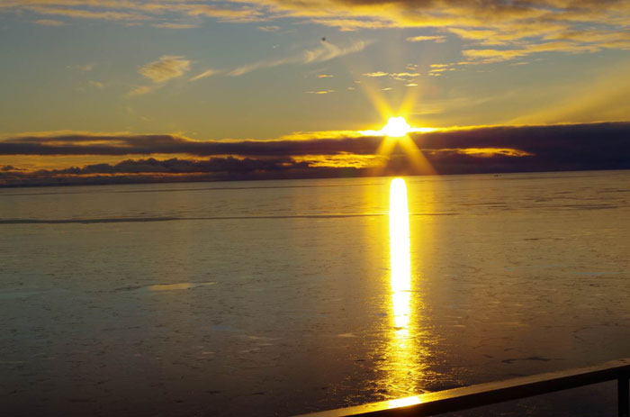 Beautiful sunrise and a thin layer of ice on the sea surface. (Mengnan Zhao)