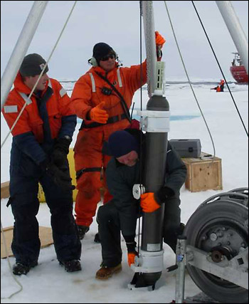 Based on the ice that we had seen from the ship, we were expecting to fly some distance before locating an appropriate floe. However, as soon as we took off, we spotted several reasonable candidates in the immediate vicinity. While none of the candidates was very large, we picked one which we thought looked the best, and when we drilled through it, found that it was a perfect 3.1 m (10 ft) thick. Shortly thereafter, Brian MacKenzie, Gary Morgan, Joe Illasiak, the WHOI mooring team, and all the ITP gear was transported to the floe. In the next 2 hours, the 10" diameter hole was augered through the ice, the profiler deployed, and the buoy surface package attached. This particular ITP is programmed to acquire 3 profiles between 7 and 750 m (23 and 2460 ft) of seawater temperature and salinity each day. These data are relayed back to Woods Hole via satellite telephone and made available on the ITP website within a few hours after the actual measurement. It was a good thing that the deployment operation went so smoothly, because it allowed everyone to be back on the ship before supper time. And this evening’s meal was a barbeque in the helicopter hanger. Steaks, chicken, sausages, fish, and hamburgers and an assortment of salads and side dishes made for a magnificent feast. Last updated: October 7, 2019 | |||||||||||||||||||||||